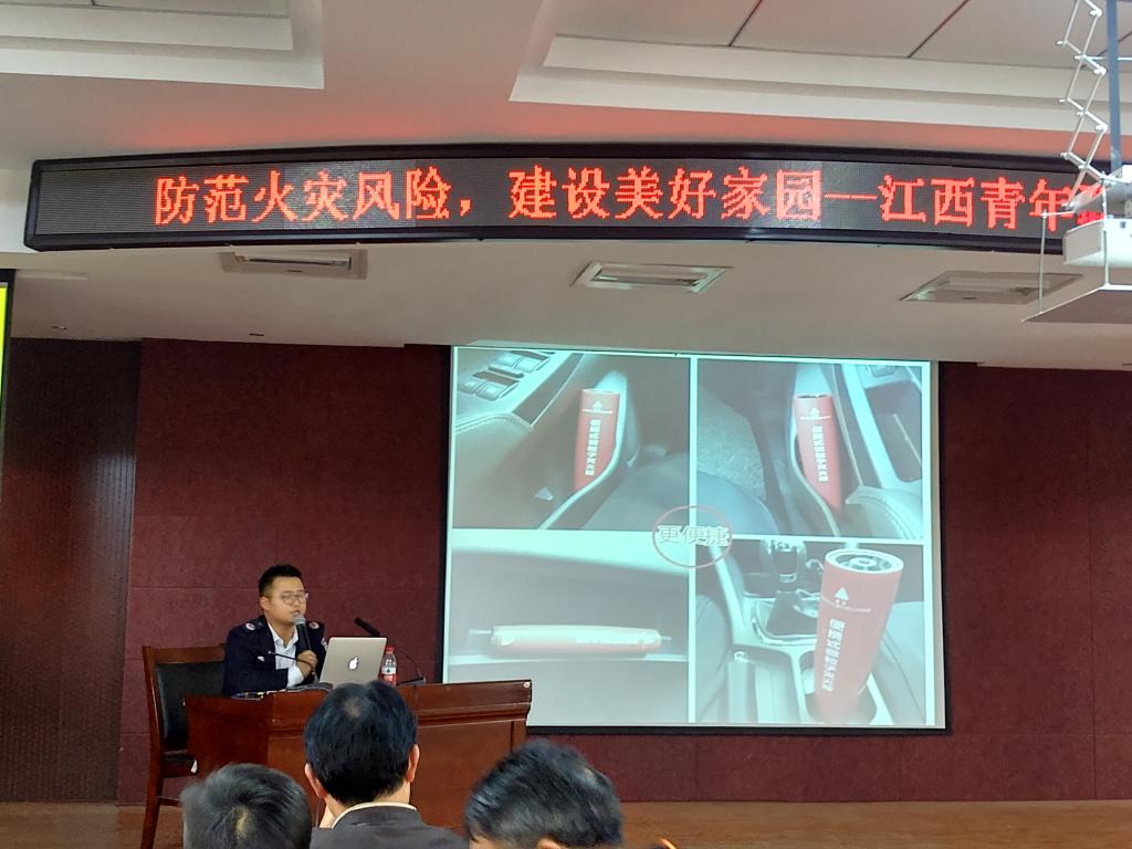 接着,刘教官为大家介绍了发生火灾时可以使用的工具,例如灭火布、灭火器;介绍了机动车中常备的灭火器、安全锤、三角架等基础安全设施,并亲自为大家示范如何使用灭火器。