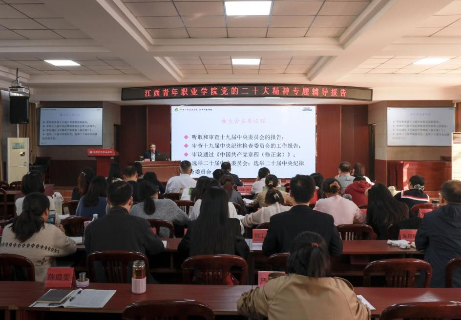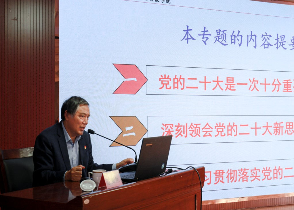 为深入学习贯彻党的二十大精神,11月1日,学校在行政楼多功能厅举行党的二十大精神学习辅导会,邀请了省委党校党史党建教研部主任、二级教授江泰然作专题辅导报告。校党委班子成员、各党支部支委、思政课教师一同聆听报告。