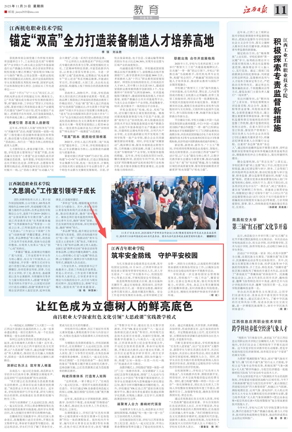 11月20日,《江西日报》第11版以“筑牢安全防线 守护平安校园”为题,报道我校安全专项检查情况。