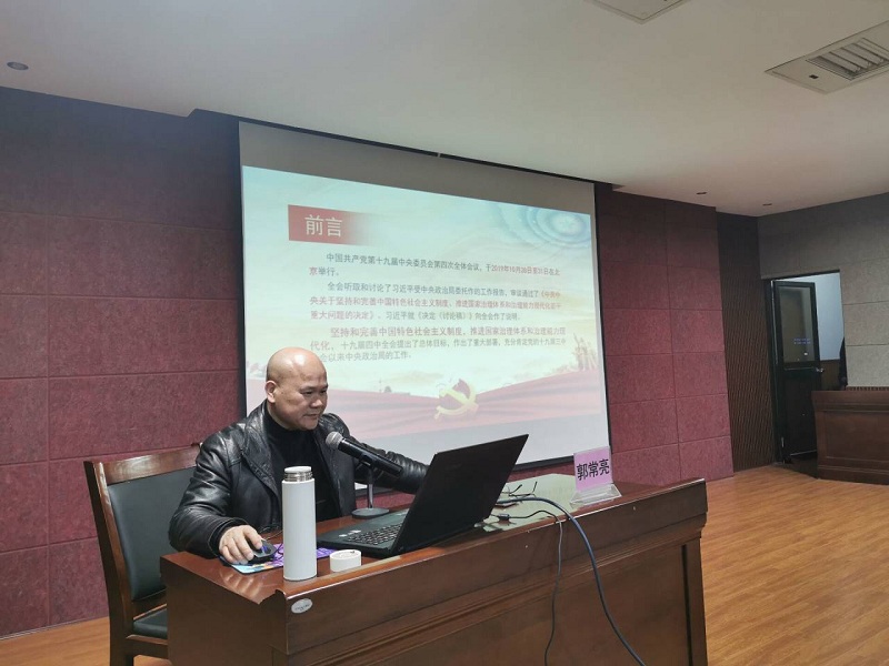 郭常亮围绕学习贯彻党的十九届四中全会精神这一主题,介绍了党的十九届四中全会的重大意义,详细阐释了中国特色社会主义制度和国家治理体系的13个显著优势。