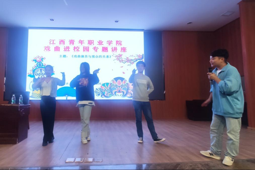 陈超老师首先对京剧、豫剧、越剧、黄梅戏、评剧等五大剧种向学生做了简单介绍,然后重点介绍了赣剧的发展过程,包括其传统剧目、角色行当等,同学们聆听得聚精会神,讲座中陈老师用《游园惊梦》、《还魂记》等几个赣剧的经典剧目与学生进行了互动。走姿规范、身段唱腔讲究、手指水袖使用等精彩的示范表演赢得了同学们的热烈掌声。场上掀起一阵阵高潮。