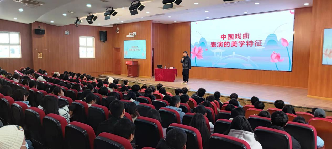 在讲座中,朱英杰老师风趣幽默、深入浅出地为同学们讲解了戏曲的起源、戏曲的表演形式、戏曲表演的美学特征等,赢得了同学们的热烈掌声。