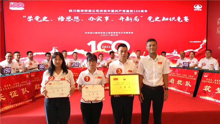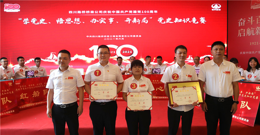 让党史学习“火”起来, 营造“比学赶超”良好氛围。本次知识竞赛已筹备一月有余,经过六月初7000余人名职工和产业工人自发参与网络初赛答题,到6月17日42家单位395名党员、预备党员及积极分子共同参与线上集中复赛答题,公司高质量高标准把关,甄选出22名党建精英进入总决赛,此次竞赛涵盖了中国共产党建党百年来的革命史、新中国史、改革开放史、社会主义发展史等选题内容,共设五个环节,分为个人必答题、小组必答题、抢答题、风险题、附加题。随着比赛向前推进,现场竞赛“火药味”逐渐浓烈,台上选手自信满满胸有成竹,台下观众津津有味全程互动,长征队、红船队、天路队、星火队、初心队、启航队、筑梦队七个队伍你追我赶,还有“幸运22”号实力加持、推波助澜,将活动氛围推向高潮。经过激烈角逐,天路队、初心队和“幸运22”、筑梦队分别荣获党史知识竞赛决赛的第一名、第二名、第三名,公司领导亲自为获奖队伍颁发奖牌和荣誉证书,和所有参赛选手合影留念。“在党史竞赛决赛开始前,我还是花了大量时间做准备, 如查看背诵‘学习强国’学习平台、党史学习教育官网号上的党史知识、党史事件,让自己对一些模糊的知识变得更加清晰。而在比赛现场,通过问答的方式,像是一种‘温故知新’,让党史学习效率得到提高,更像是一种“隔空对话”,重走了一次红色岁月”,参赛选手如是说。本次知识竞赛结合公司工作实际,将川桥“发家史”融入到党史学习教育中,以赛促学、以学促行,坚定了信仰之“基、补强了精神之钙。
