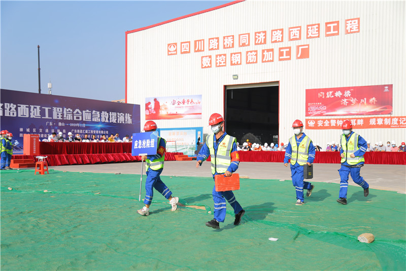 为认真贯彻落实佛山市禅城区交通运输局印发《佛山市禅城区交通运输局(区轨道交通局)突发事件应急管理工作规范》和《佛山市禅城区交通运输行业突发事件总体应急预案》的文件精神,不断提高项目应对突发事件的应急保障能力。2020年11月24日下午15:30,同济路西延工程组织开展了2020年综合应急救援演练,禅城区交通运输局质管科科长叶峰、安全科副科长邱建萍、交建科副科长尚建国、广东佛盈汇建工程管理有限公司总经理胡英豪、副总经理陈金水、胡永强、总工程师姜同辉、佛山市第一人民医院禅城医院及建设单位管辖的其他在建公路工程、市政工程、水利工程、房建工程的监理单位总监及施工单位项目经理等七十余人到场观摩指导。