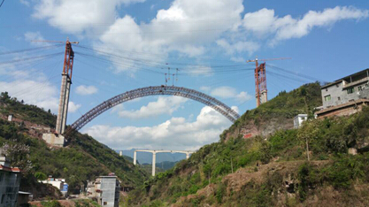 大桥采用无支架缆索吊装施工技术,该技术工艺极其复杂,C100砼是首次在国内桥梁工程应用,其科技含量极高且对桥梁工程发展意义重大。由于古蔺地处山区交通极为不便,气候条件恶劣,开工时间较原计划晚了一年之久,工期紧、施工难度极大,面对重重困难,项目部全体员工在领导班子的带领下充分发扬了伟大的“川桥人”精神,勇于担当,敢于破难,团结一心,艰苦奋战,大力开展科技攻关,科学组织施工生产,取得了一个又一个的阶段性胜利,2014年3月20日拱座开挖,2014年5月拱座施工完成,2014年10月交界墩施工完成,2014年11月7日索塔拼装,2014年12月31日索塔拼装完成,2015年1月31日缆索系统形成,2015年2月6日开始吊装主桥钢管劲性骨架,2015年3月28日劲性骨架合龙,50天实现了主桥合龙,其中凝聚了“川桥人”的艰辛、智慧和汗水。
