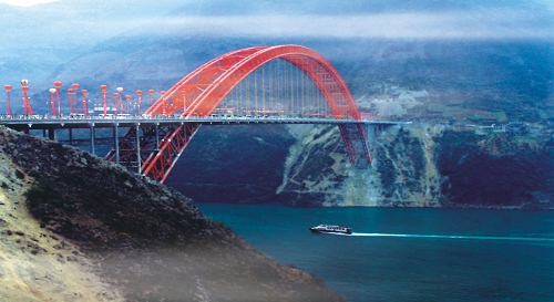 重庆巫山长江大桥全长612.2米,主跨460米,中承式钢管砼拱桥,主跨居同期同类桥梁世界第一,创下组合跨径、每节段缆索吊装重量、吊塔距离、拱圈管道直径和吊装高度5项世界第一,名列“世界百座名桥”,2005年1月建成通车。