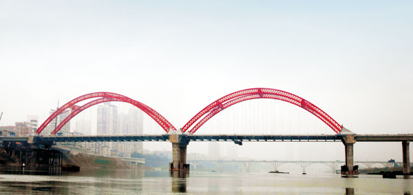主桥为2*160米下承式钢管混凝土刚架系杆拱桥,主拱桥, 主拱为横哑铃式平行拱,主桥长320米,