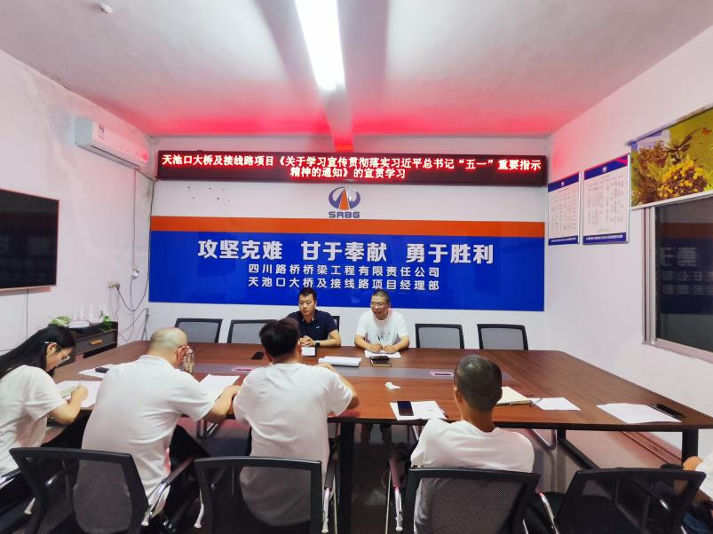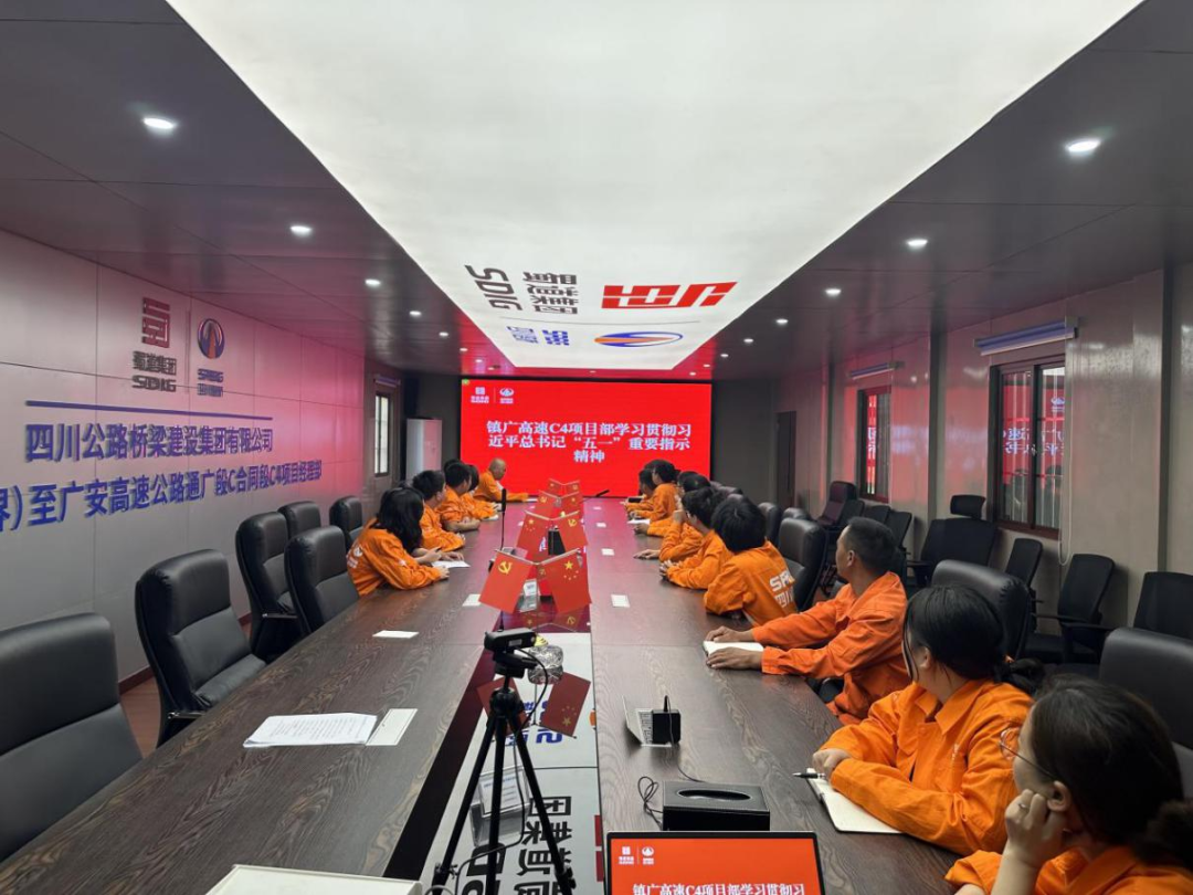 (四)镇广高速C4项目工会小组组织职工在项目会议室组织召开学习贯彻习近平总书记“五一”重要指示精神,深入学习习近平总书记对劳动群众的指示精神和殷切希望,20位职工参与宣贯学习。项目部将以改革促发展、以实干谱新篇,抓住黄金施工期,营造主动实干、奋勇争先浓厚氛围,最大限度激发广大职工群众的劳动热情和创造活力,切实把习近平总书记的关心关怀转化为奋进新征程,建功新时代的强劲动力。